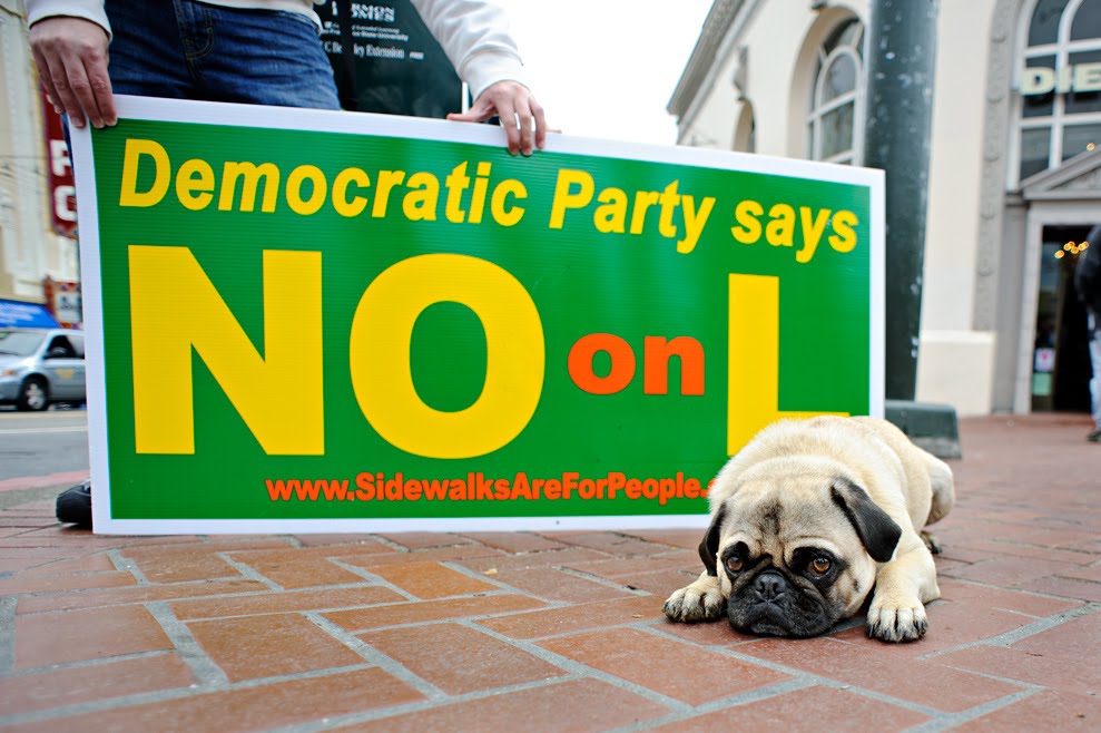 My human says I'm not allowed to talk about sex, religion or politics here on The Daily Puglet. And that's usually fine by me because I don't usually care about any of those things. But not today. Today, I care. Because yesterday I saw this dude holding a sign telling people to vote NO on something called Proposition L. The dude said if enough people vote yes, San Francisco will ban sitting or lying on public sidewalks - something I do all the time. His sign, as you can see, says sidewalks are for people.